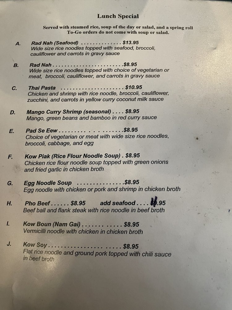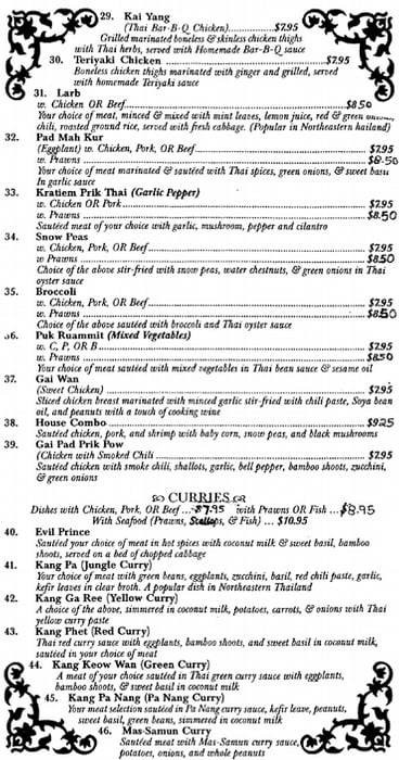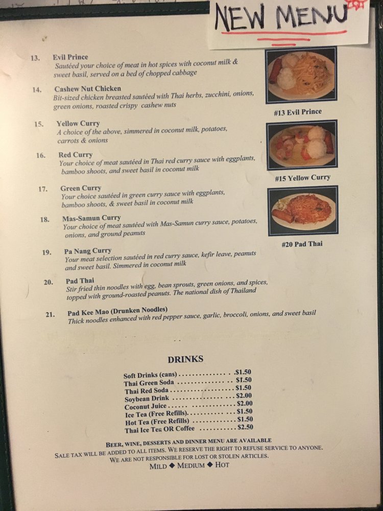 The menu features a variety of delectable dishes that showcase vibrant flavors and high-quality ingredients. Signature options include the beloved Evil Prince and Mango Curry Shrimp, both praised for their bold tastes. For lunch, indulge in the Rad Nah or Pad Se Eew, each offering satisfying portions at reasonable prices.